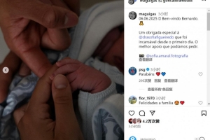 贡萨洛-拉莫斯与女友玛格丽达联合发布社媒,晒出与新生儿牵手的照片,玛格丽达写道:“2025年6月6日,欢迎你,贝尔纳多。特别感谢索菲娅医生,她从第一天起就不知疲倦地支持我们,是我们能得到的最好助力。”