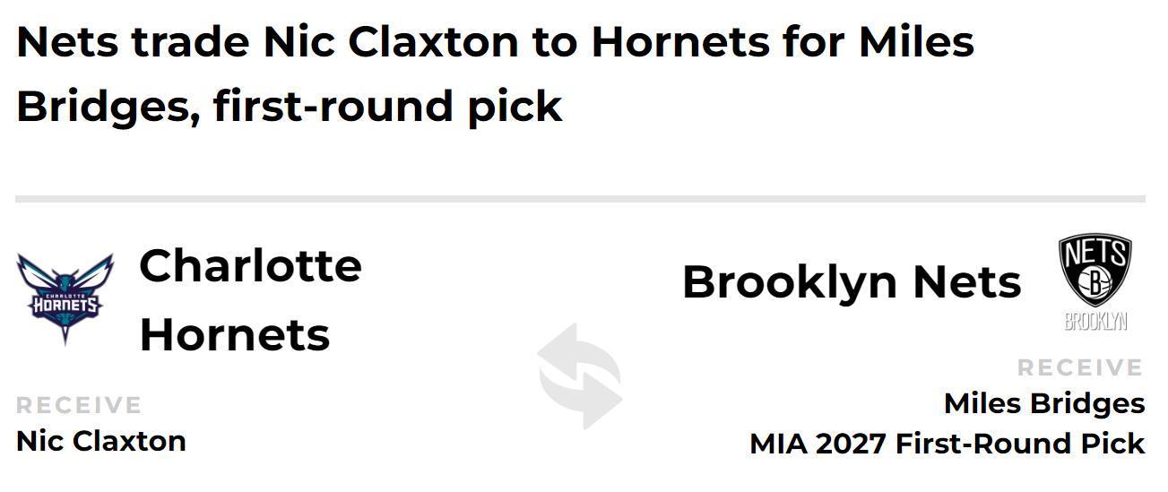 篮网得到:迈尔斯-布里奇斯+2027年热火首轮签。