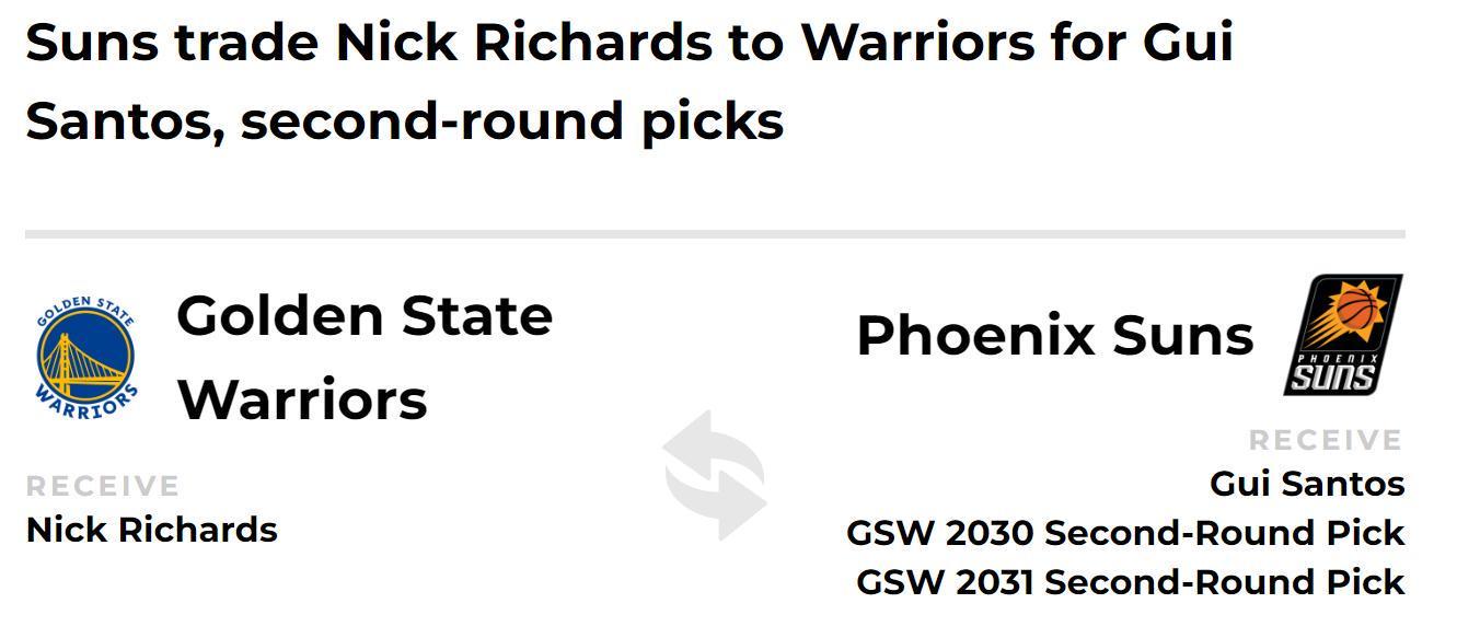 太阳得到:桑托斯+勇士30年二轮签+勇士31年二轮签。